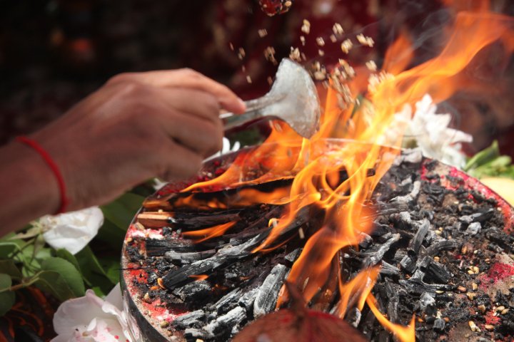 This puja (worship ritual before a yagna) is offered to the ancestors of the bride and groom seeking their blessings. This is followed by Gaye Holud which is a ceremonial bath at the bride and groom’s respective residences by five or seven married ladies. Turmeric paste is annointed to the face and feet. This tradition can become fun and playful with smearing of turmeric between the ladies.